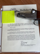 I have for your consideration a beautiful Parker GH 16 gauge shotgun with 30" Damascus barrels. The Damascus pattern on these barrels is very bright. You can tell this gun was well taken care of. The bores are bright and shiny. Lock up is tight on this Parker. It is choked for the uplands and on a O frame for easy carrying. At one point the splinter forearm was broken and has been professionally repaired. I have close up pictures to show that. The repair is hardly noticeable from the outside of the forearm unless you look very close. A factory letter from the Parker Gun Collectors Association accompanies this gun. According to the Parker Story Book there were only 79 Parkers in this configuration built. Here are the specs: